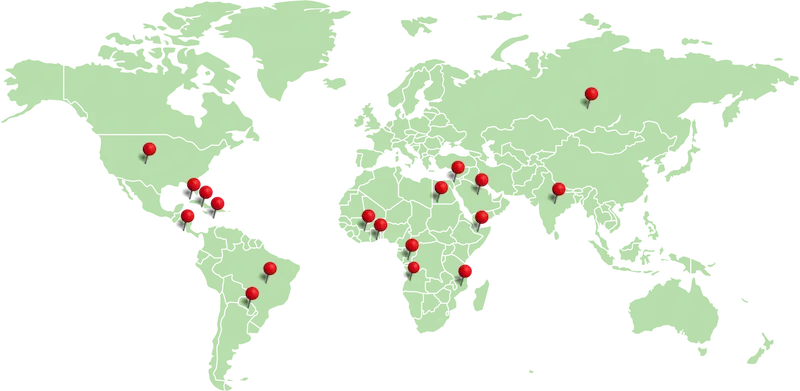 Presente em 18 países: Brasil | Cuba | Panamá | Paraguai | Porto Rico | Estados Unidos | Angola | Djibouti | República do Congo | Egito | Gana | Jordânia | Índia | Moçambique | Guiné-Bissau | Catar | Rússia | Togo